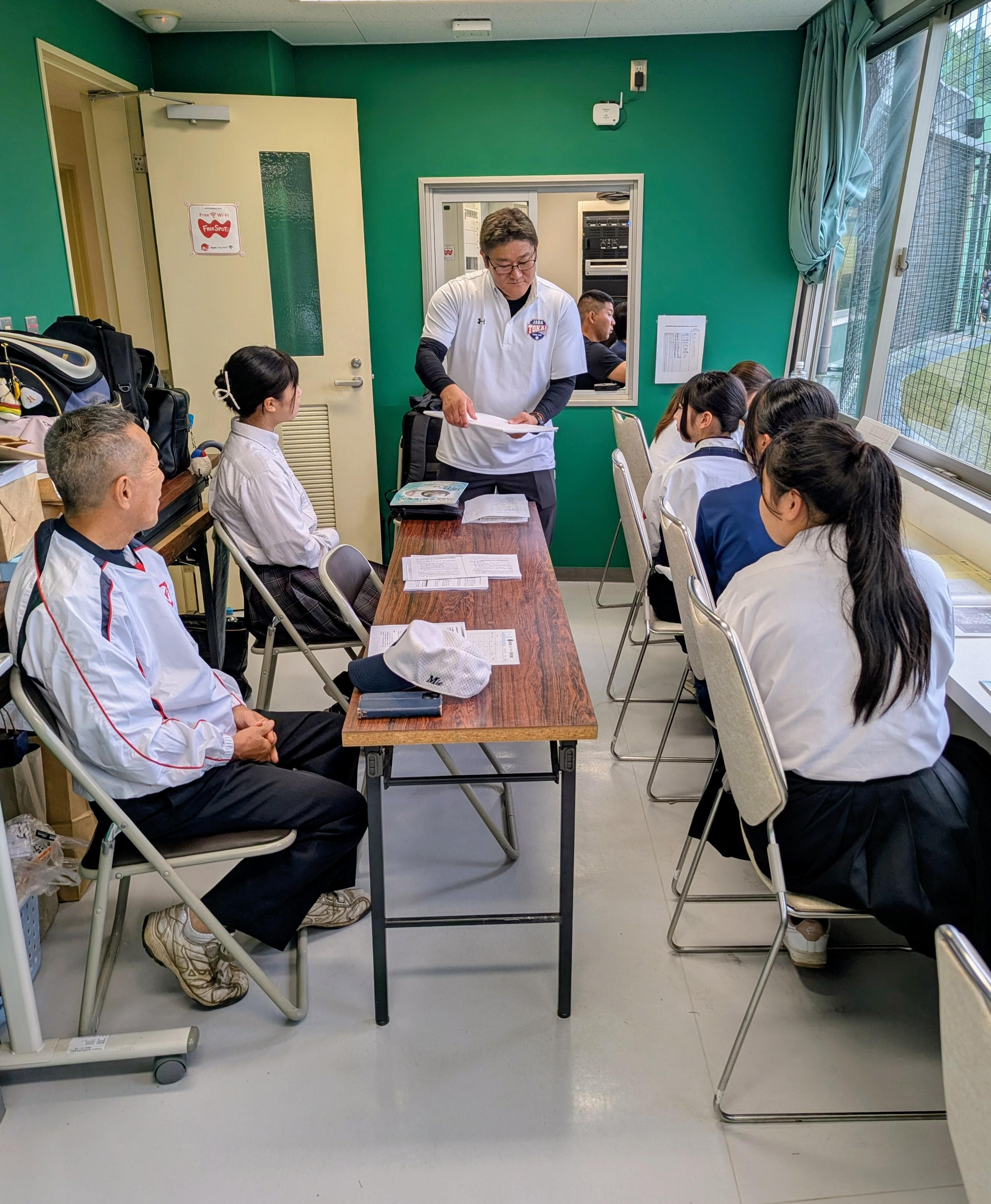 10/18(土)、ダイムスタジアム伊勢の記録室では、野道一寿公式記録員の指導で勉強会が開催され、四日市工業高校、桑名工業高校、尾鷲高校の生徒が参加しました。