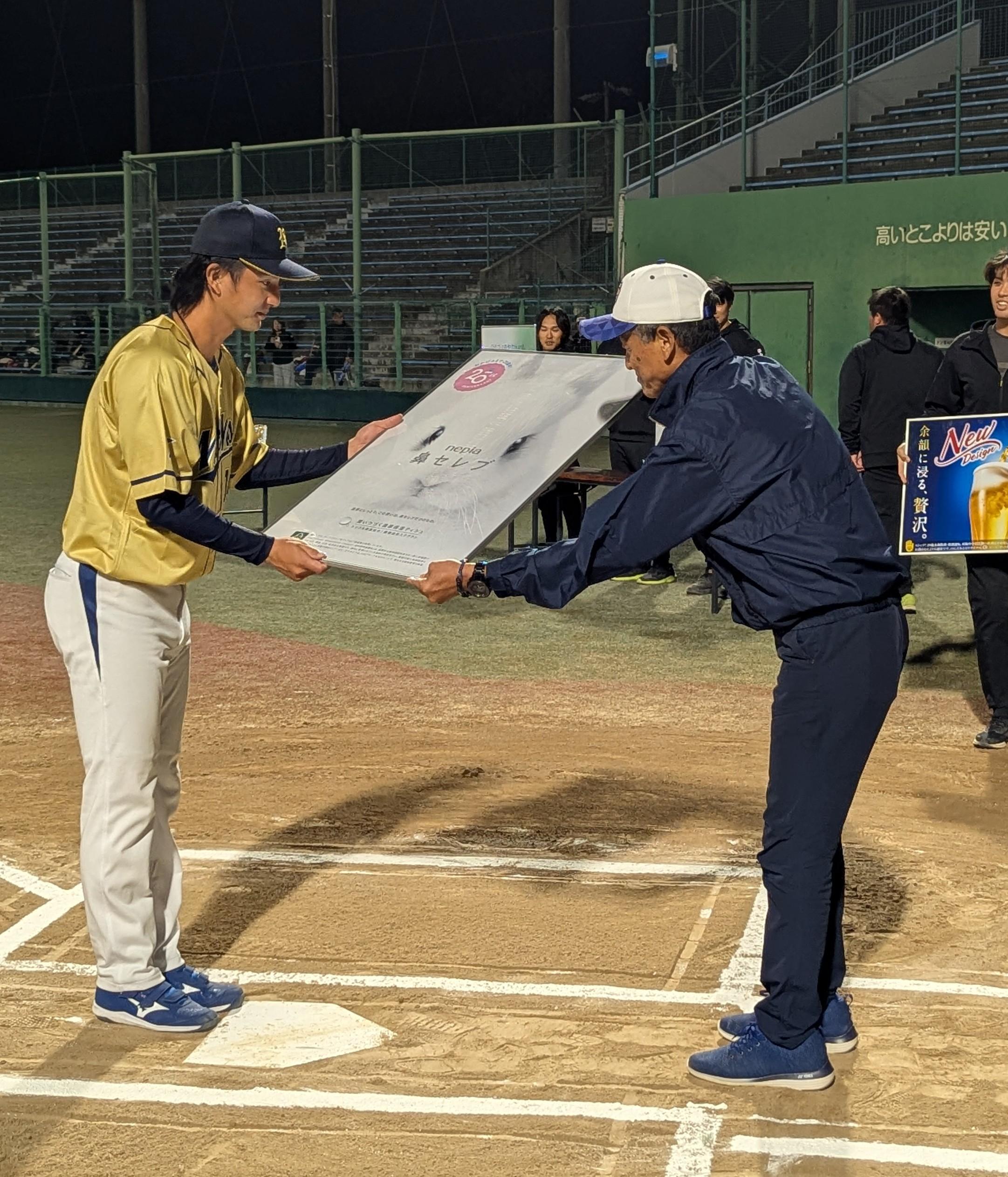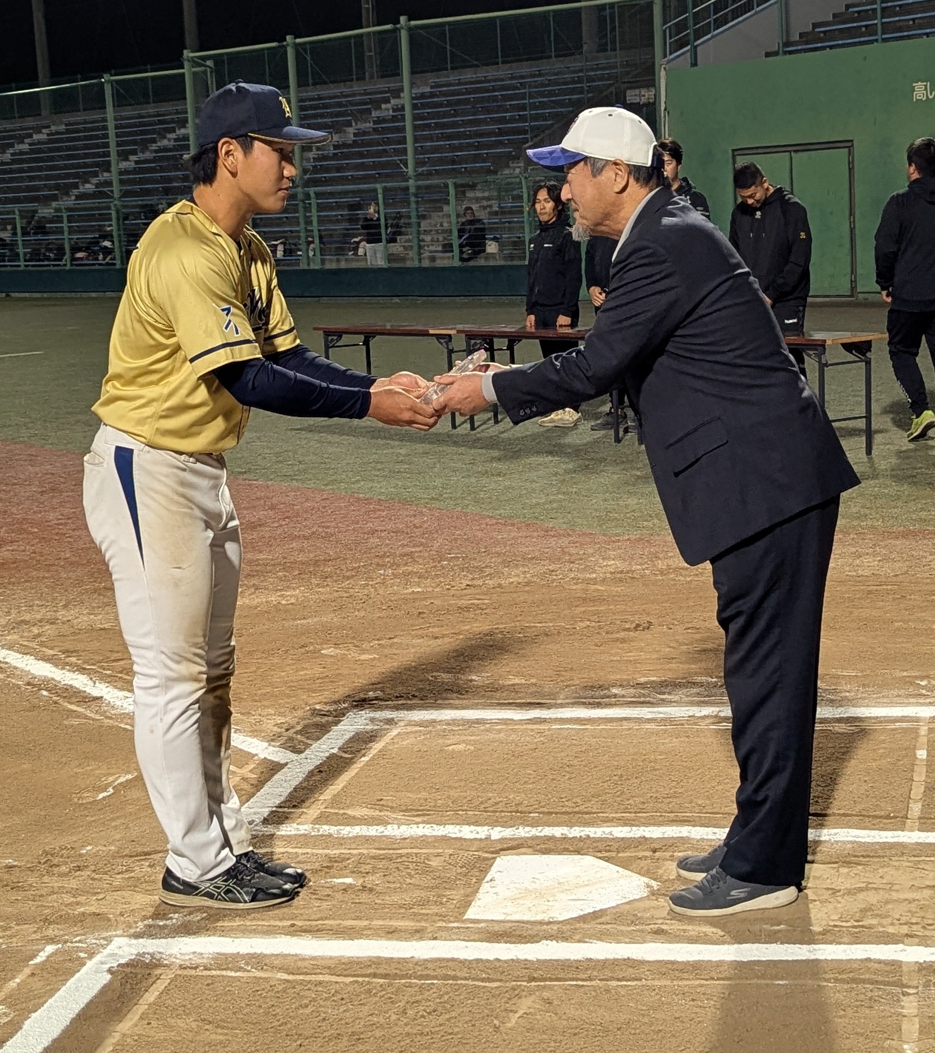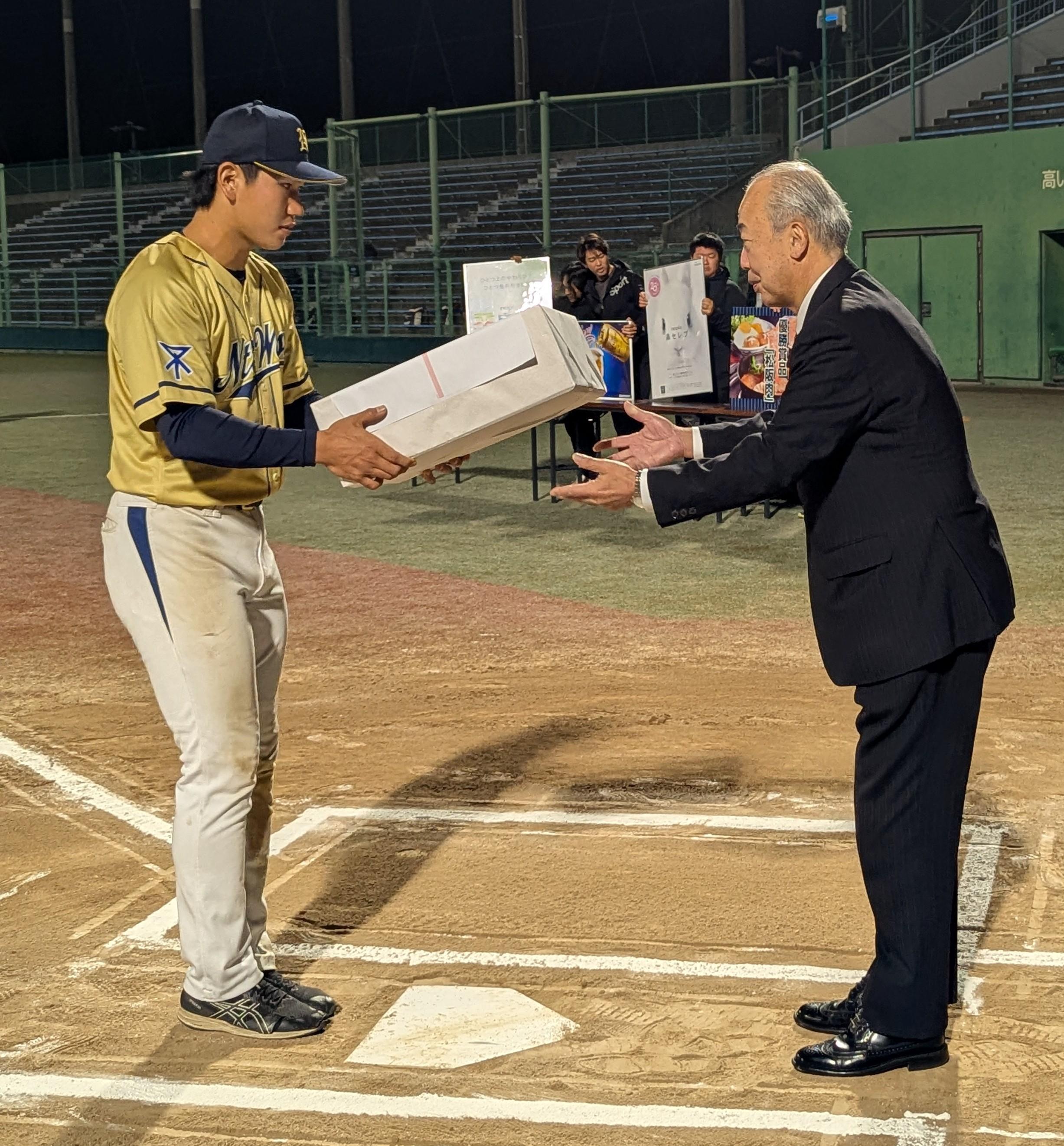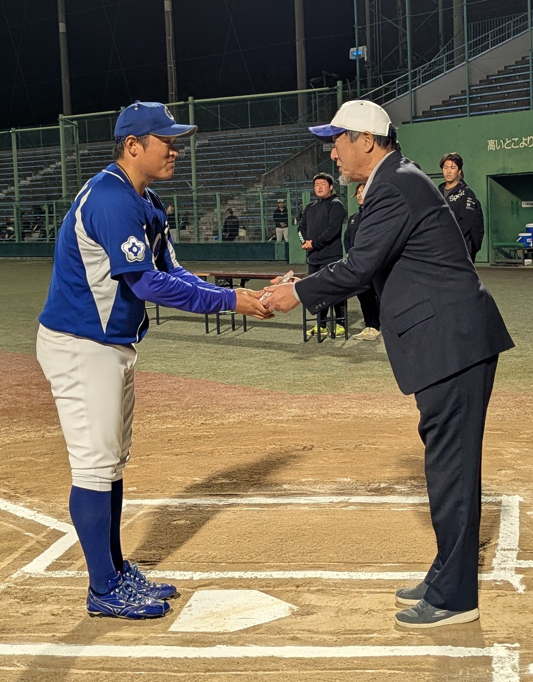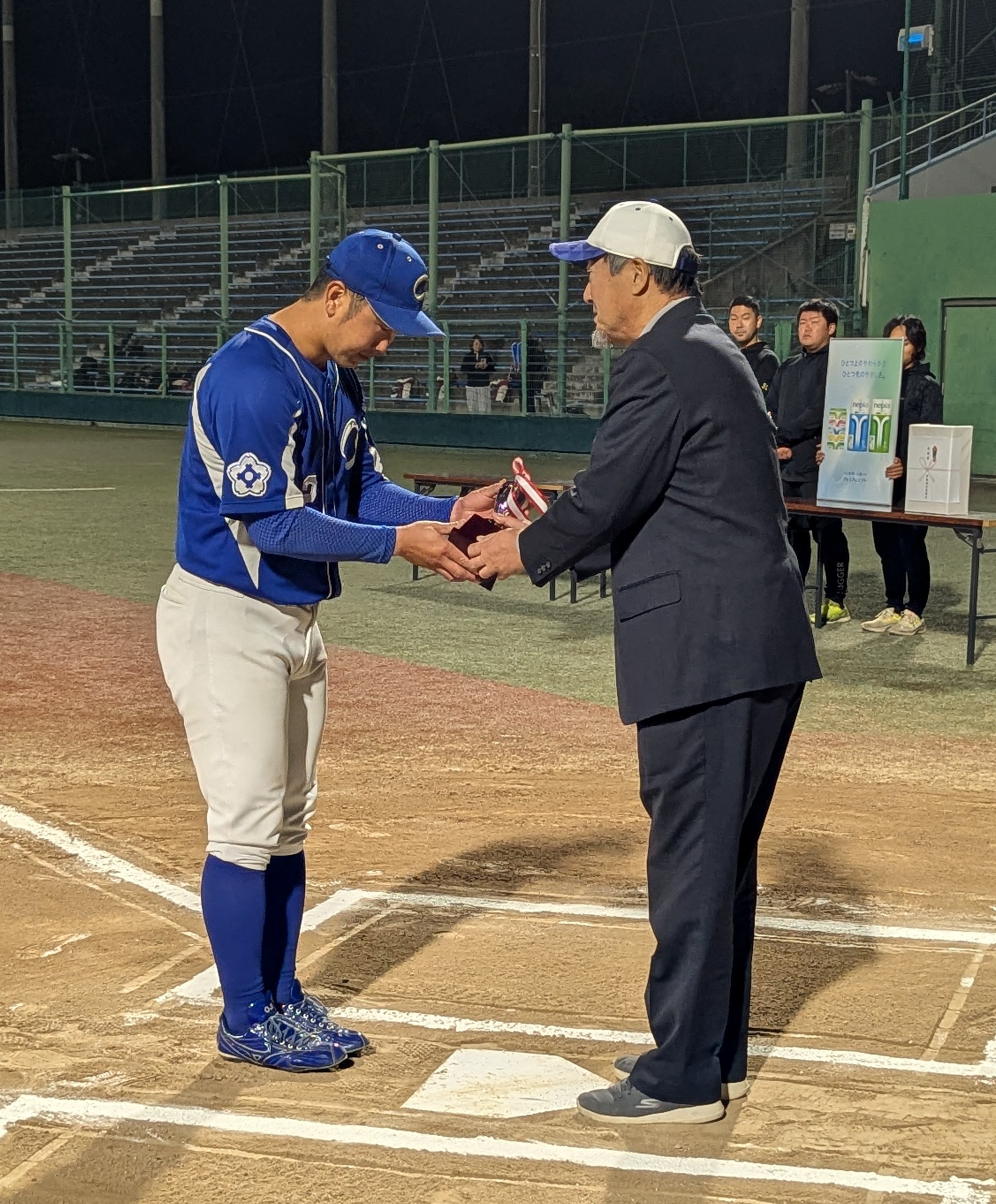 田中晃稔・日本野球連盟東海地区連盟専務理事から日本野球連盟東海地区連盟優勝杯を授与