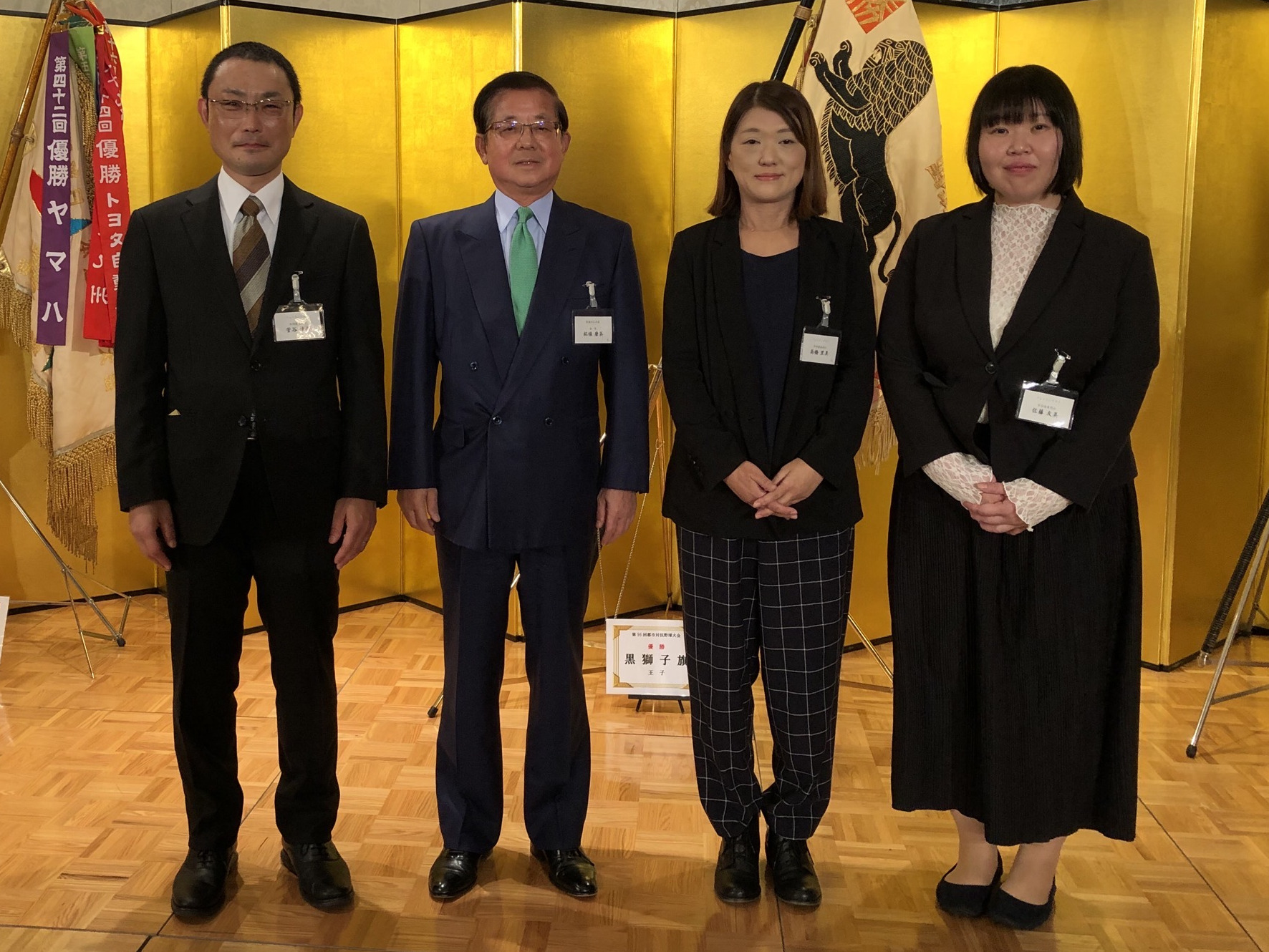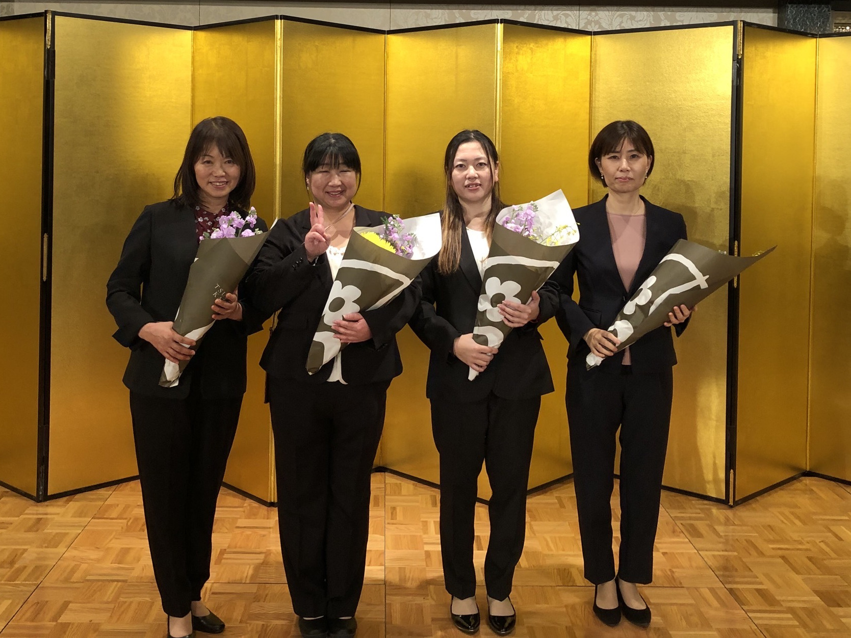 柘植会長と記念撮影をする菅谷さん、高橋さん、佐藤さん