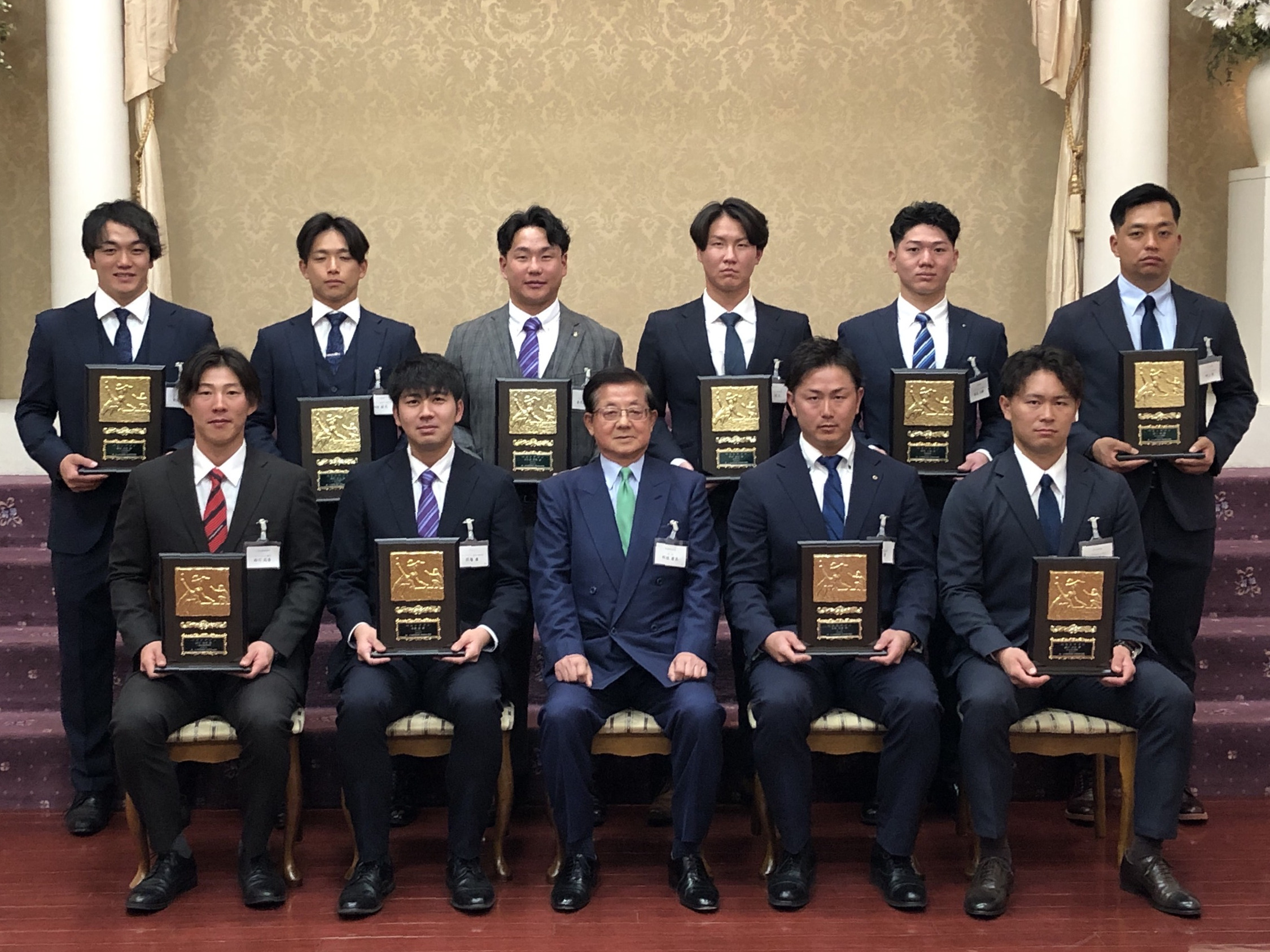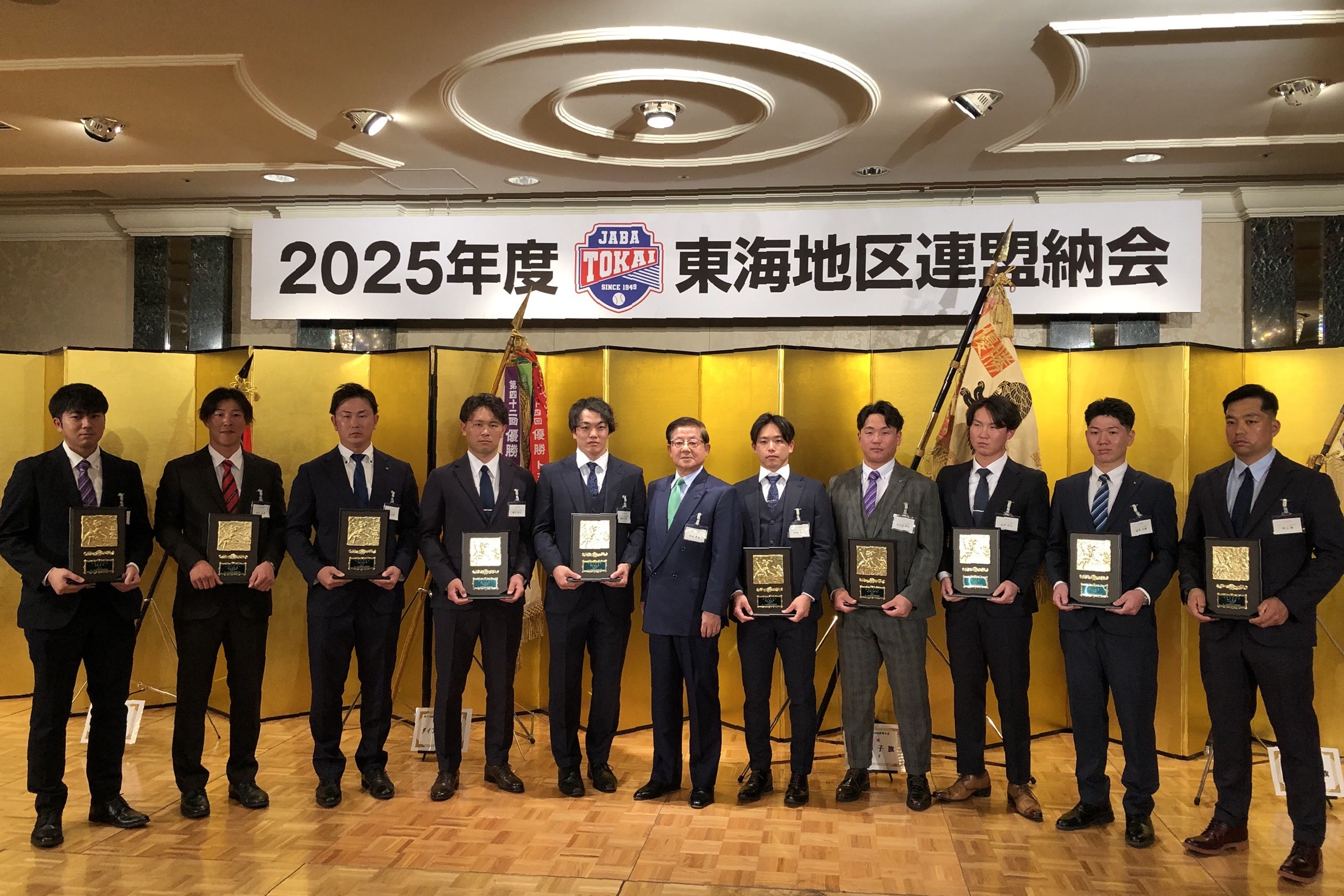 12/9(火)、2025年度日本野球連盟東海地区連盟納会を名古屋マリオットアソシアホテル「アゼリア」で開催し、ベストナインをはじめとする各賞受賞者の表彰を行いました。