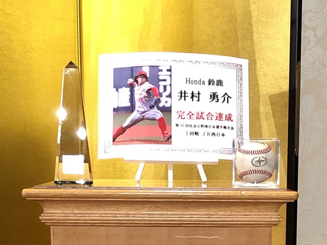 第50回社会人野球日本選手権大会で完全試合を達成した井村勇介選手(Honda鈴鹿)の特別賞と記念ボールも展示