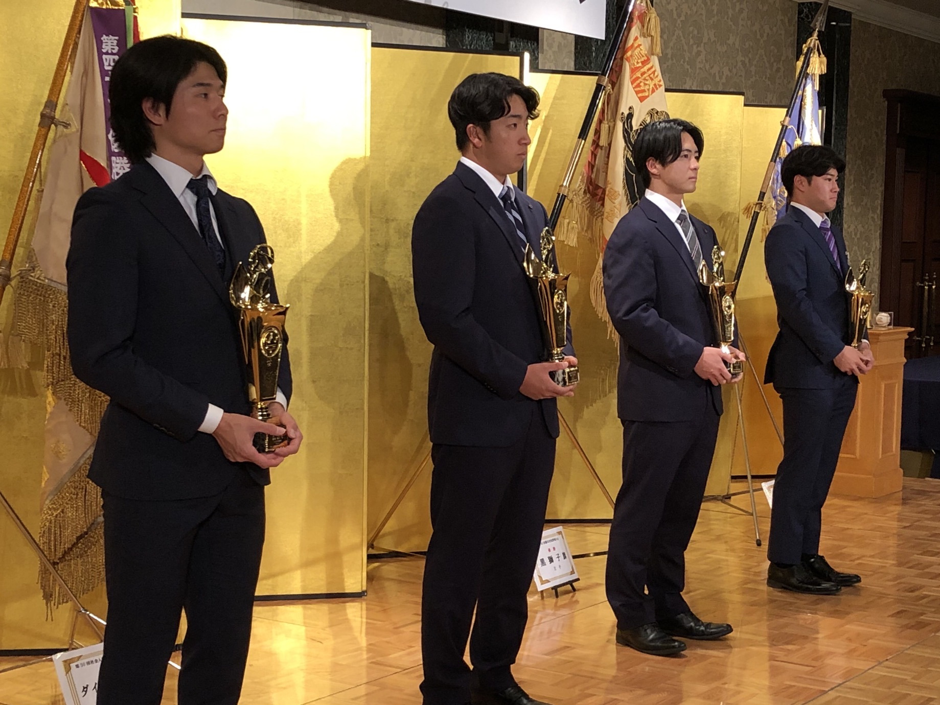 左から武田賞・増居翔太選手(トヨタ自動車)、優秀投手賞・樋口新選手(王子)、新人賞・柴崎聖人選手(王子)、同・土山翔生選手(ヤマハ)